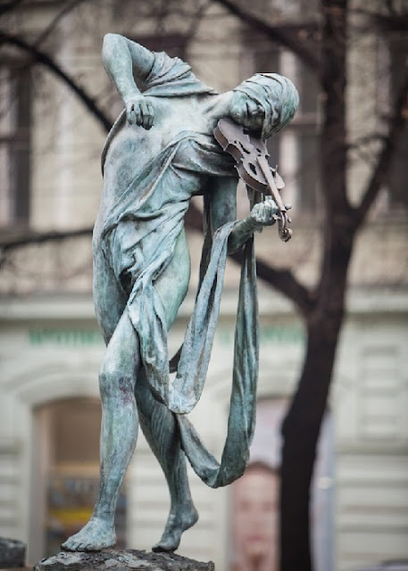 Первой мы видим изящную девушку со скрипкой в руках, красивая фигура которой изогнута и напряжена как струна. Она поглощена неуемной страстью, которой целиком отдается настоящий музыкант, играя на любимом инструменте. Фигура этой девушки, по замыслу скульптора, олицетворяет реку Дунай - одну из самых длинных рек Европы, такая же красивая и величавая.